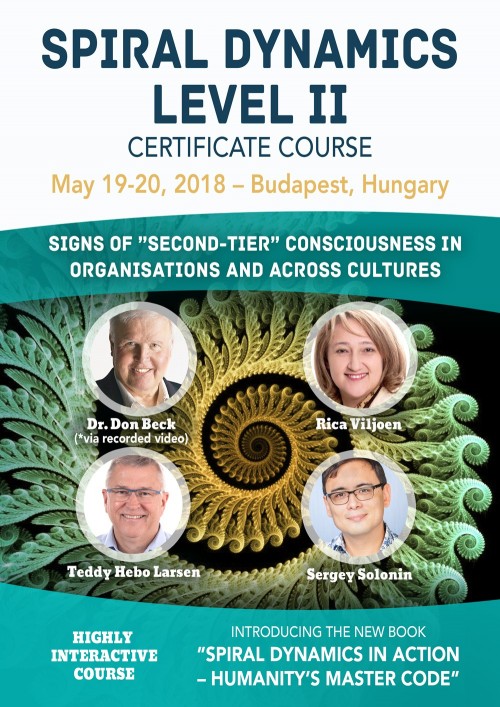 During this 2-day Spiral Dynamics Level II Course chaired by Dr. Rica Viljoen, Mr. Sergey Solonin and Mr. Teddy Hebo Larsen the focus will be on identifying and discussing signs of emerging second-tier consciousness (Yellow memev - not to be confused with TEAL) in organisations and across cultures. The course will be highly engaging and interactive and participants will be given the opportunity to work with the practical application of Spiral Dynamics applied on real-life organisational and global geopolitical challenges/opportunities.
