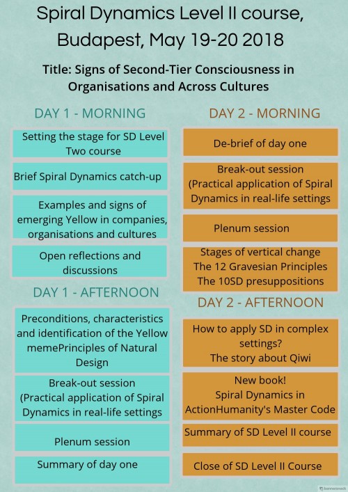 Spiral Dynamics Level One certification or basic understanding of the fundamentals of the Spiral Dynamics theory and concept. With this Level II course we will add the next level of complexity.